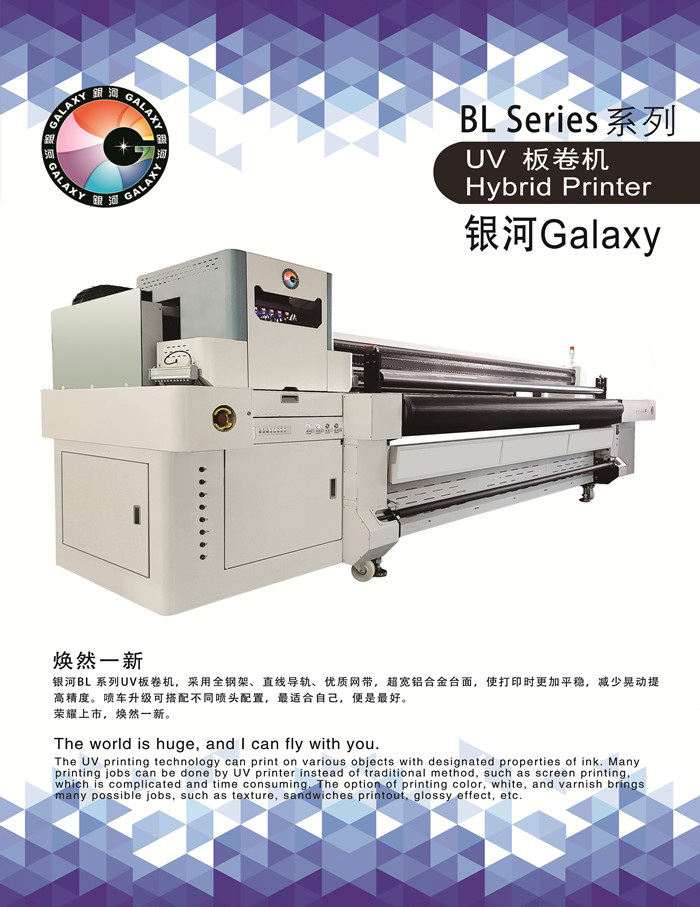 銀河BL系列UV板卷機,采用全鋼架、直線導軌、優質網帶,超寬鋁合金臺面,使打印時更加平穩,減少晃動提 高精度。噴車升級可搭配不同噴頭配置,最適合自己,便是最好。 榮耀上市,煥然一新。